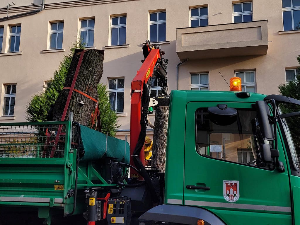 Das abgetrennte obere Stammstück wurde durch das Grünflächenamt zu Wolfgangs Bienenwagen transportiert und dort gesichert aufgestellt. Vermutlich befindet sich aktuell jedoch kein Bienenvolk mehr darin, da an den letzten herbstlichen Tagen über 15 °C keine Flugaktivität zu beobachten war.
