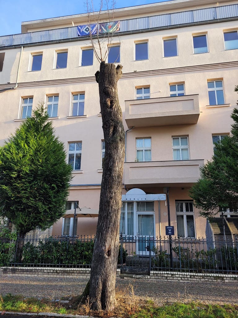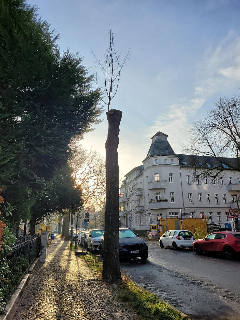 Am 12.11.2025 wurde dieser Baumstamm gefällt. Das obere Stammstück, in dem das im Sommer und Herbst gesichtete Volk vermutet wurde, konnte dabei erhalten werden. Die beiden Einfluglöcher wurden anschließend verschlossen, um Passanten und Mitarbeitende des Grünflächenamtes zu schützen. Eine Kontrolle, ob sich noch ein aktives Volk im Stamm befand, war daher nicht möglich. Danach wurde der Baum unterhalb der Höhlung vollständig entfernt, um Platz für die Pflanzung eines neuen Straßenbaums zu schaffen.