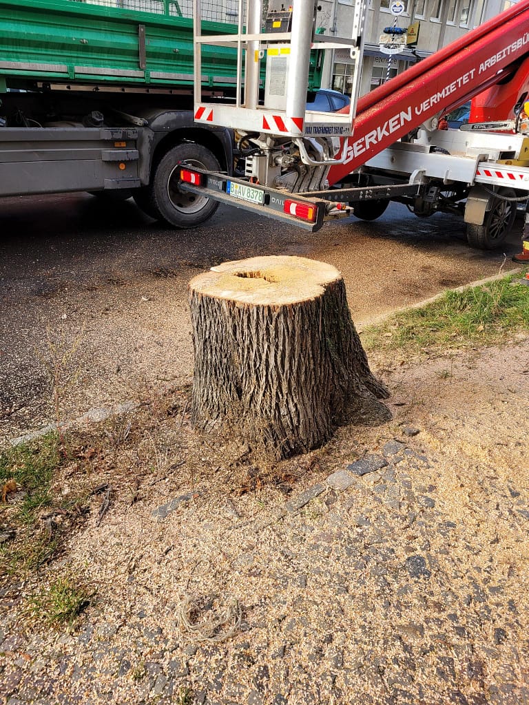 Zum Zeitpunkt unseres Eintreffens war der Baum bereits weitgehend gekappt – nur der Stamm, in dem das vermutete Bienenvolk saß, stand noch am Straßenrand.